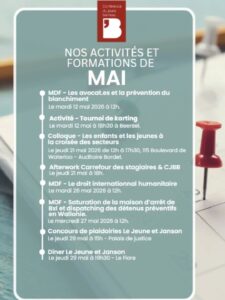 Les prochaines semaines pourraient n’être qu’un calendrier : un bowling, un « afterwork » fléchettes, un tournoi d’échecs et de jeux de société. Une seconde conférence avec la Commission diversité et inclusion, cette fois sur le port des signes convictionnels chez les avocats. Un film-débat autour de la petite Mawda, cette enfant de deux ans morte d’un tir policier alors qu’elle fuyait avec les siens. La Clinique juridique, où nous répondrons, en direct, aux questions de celles et ceux qui n’ont ni les codes ni les moyens.